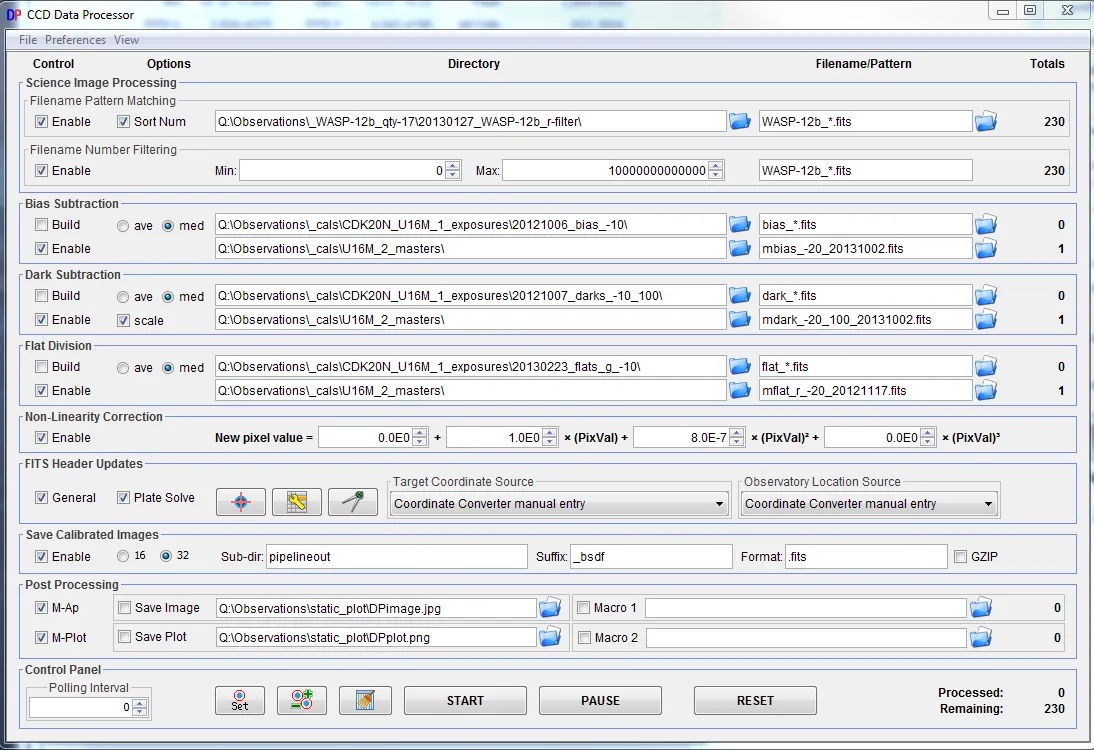Multi-image processing (bias, dark, flat, CCD non-linearity correction)