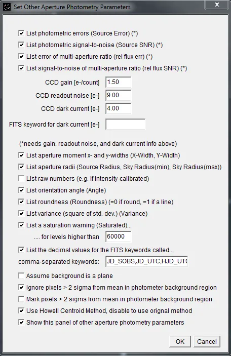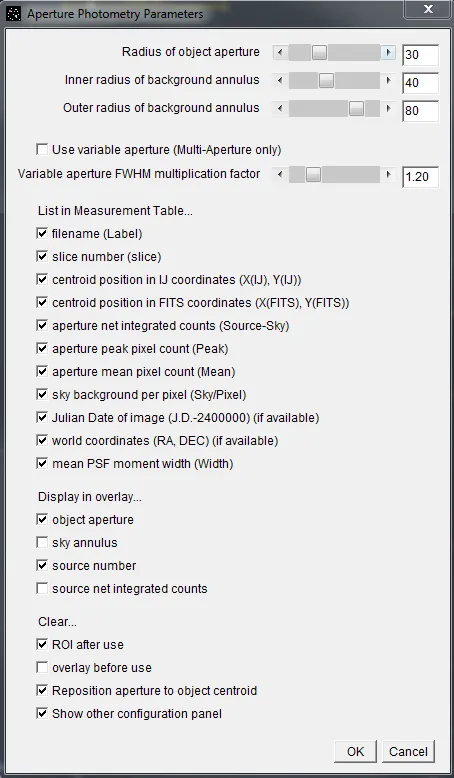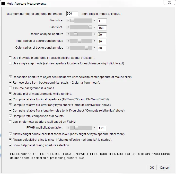 Section titled “Variable Aperture Usage”The “Multi-aperture Measurements” setup panel that was discussed previously has an option labeled “Vary photometer aperture radii based on FWHM” and a “FWHM multiplication factor” below. The variable aperture mode first estimates the FWHM of the object inside all of the apertures and calculates the mean FWHM for the image. Then the aperture radii of all apertures in the image is set to FWHM x multiplication factor. The idea is to allow the aperture radii to expand and contract with scintillation changes and/or focus drift, etc.