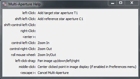 Now click OK. The MA setup panel will close, any apertures shown in the image overlay will be automatically cleared, and the “Multi-Aperture Help” window shown below will open. Note that the help window is active, so check for different mouse/keyboard stroke actions available after each step in the aperture selection process. For the normal case of one target star and several comparison stars, left-click on the target star first. A green “target” aperture will be shown in the image overlay centered at the star. Then, left-click near additional stars to place red “comparison” star apertures. To remove an aperture, left-click inside the aperture. The image with aperture overlays should look similar to the example shown below. When you have selected all desired comparison stars, either press <Enter> or right click in the image to start processing all of the images.