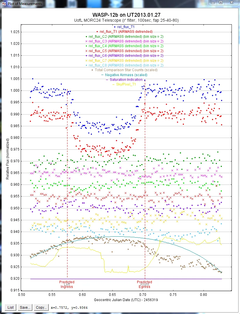 Section titled “Overview of the Y-axis data”Target star light curve – the target star light curve is plotted twice. The top (blue dots) light curve is the normalized relative flux of the target star, with no detrending applied. The second lightcurve is also the target star normalized flux, but AIRMASS detrending has been fitted to the out-of-transit region of data, and then the fit has been applied to the entire light curve. In this case the AIRMASS trend is negligible, so the two curves are nearly identical, except that the red dot curve has been shifted down by 0.01 normalized units (see the “then Shift” setting in the second row of plot settings).