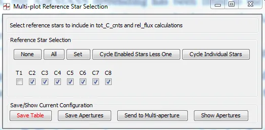 Section titled “Changing the Comparison Star Ensemble without Rerunning Multi-Aperture”The comparison star ensemble can be changed in Multi-Plot using the “Multi-Plot Reference Star Selection” panel shown below. If this panel is already open or is hidden behind another window, click the “Ref. Stars” button in the lower-right corner of the Multi-plot Main panel. Deselecting a comparison star (i.e. Cx) will change the star to a target star (i.e. Tx), which removes it from the comparison star ensemble. Buttons are available to cycle though all individual stars, or to cycle through all enabled stars less one comparison star. The table and plot are updated automatically after each click making it easy to assess the quality of comparison stars.
