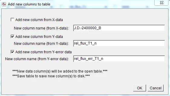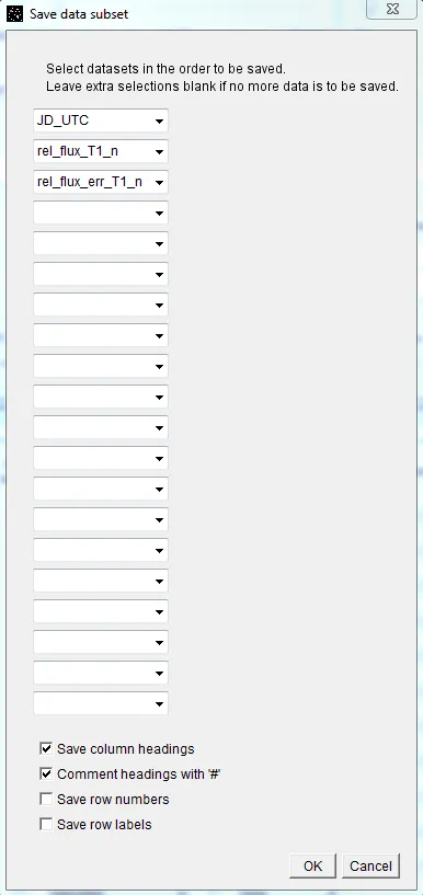 Section titled “Save a subset of Data to Send to Collaborators”Since the measurements table produced by Multi-aperture contain large numbers of data columns, it is often desirable to send a subset of the data to collaborators. To do so, use the Multi-plot_Main->File->”Save data subset to file” menu item. The following panel will open. The settings shown will produce a 3 column table containing time, relative flux normalized, and relative flux error normalized (recall that the rel_flux_T1_n and rel_flux_err_T1_n data columns were added to the table using the “New Col” icon). After clicking OK, a file save dialog will open. Navigate to the folder and enter the desired file name and click SAVE to create the file.