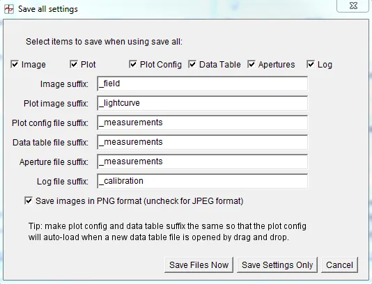 If you only want to save a subset of the files listed, disable the unneeded files at the top. To change the default file name suffix, type in the relevant box. Click “Save Files Now” and a file save dialog will open. Navigate to the desired save folder and enter the desired file name prefix and click SAVE. The selected files will be created.
